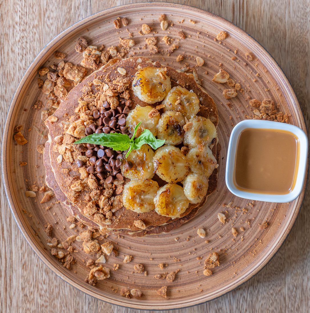 Pancakes integrales con chips de chocolate 60% cacao, banano asado y granola, acompañado con salsa de arequipe sin azúcar.