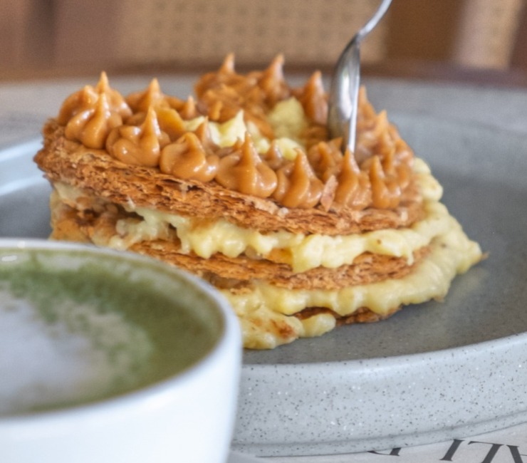 Milhoja integral con arequipe y crema pastelera sin azúcar, su forma de corazón manifiesta nuestro amor por un estilo de vida saludable.