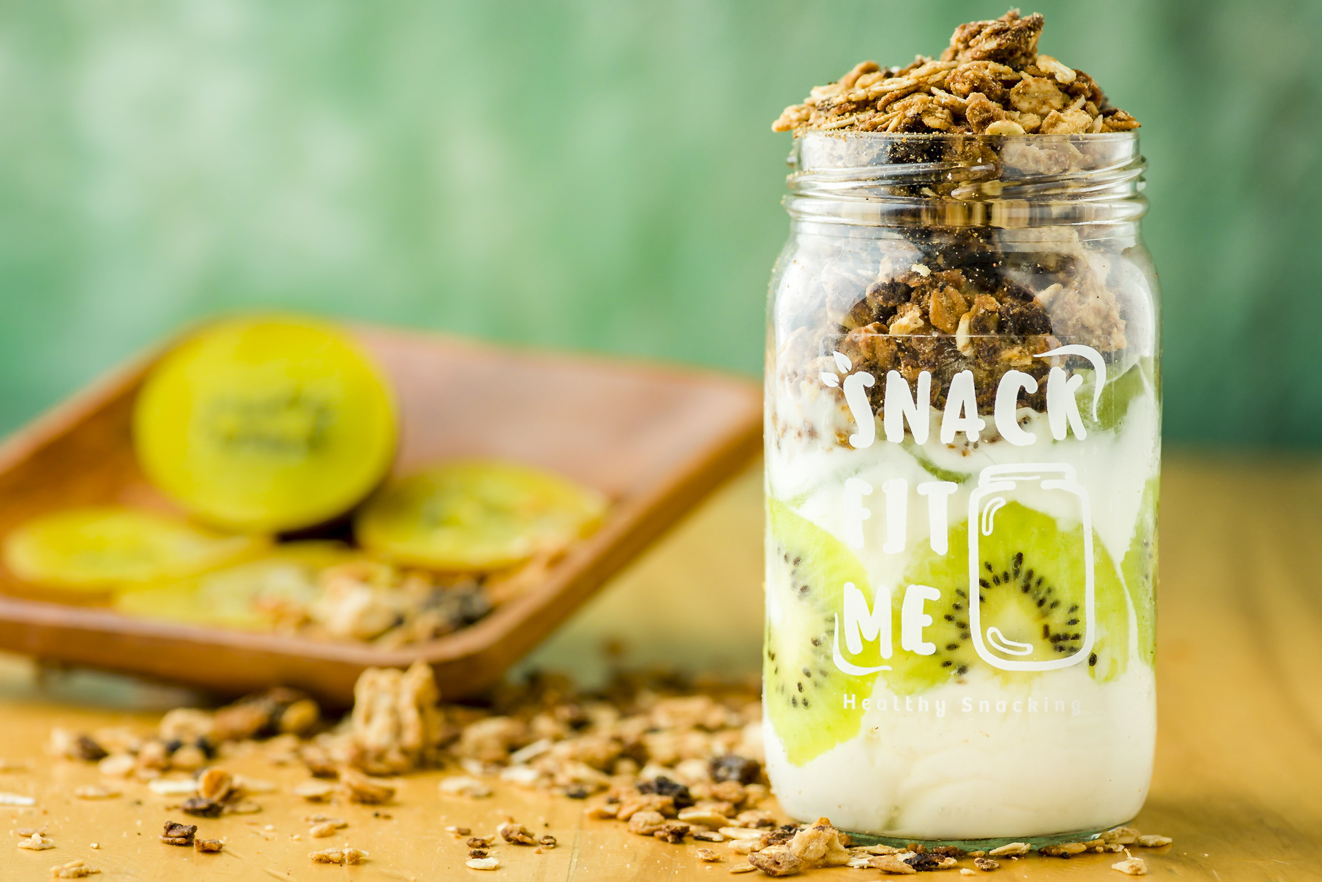 Yogurt Griego endulzado con stevia, kiwi y granola artesanal.