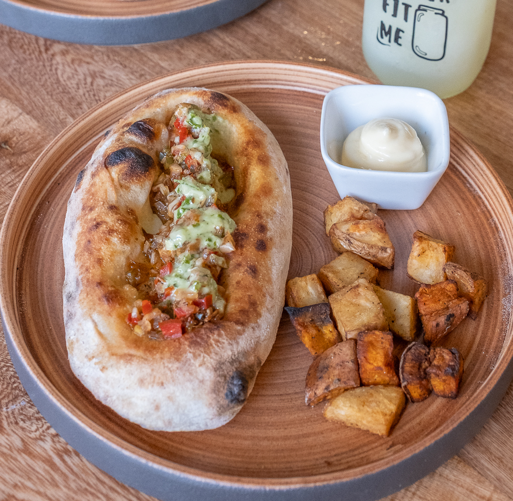 Perro pizza horneado a leña, con salchicha de pavo chimichurri hecha en casa y mozzarella de búfala.